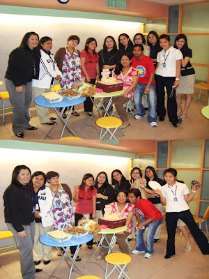 yesterday after work we gave Roma a simple baby shower for soon to be borne baby Dela Cruz scheduled under normal delivery on the first week of July and since Roma's birthday will be in less than 2 weeks time we decided to give her an advance birthday cake blow-out too (tipid-tipid, acc to the girls!). we made a little surprise on her and it works, just in time when she was about to go home na we invited Roma and husband at the Nibble Room...and both of them was delighted seeing us ready to party!